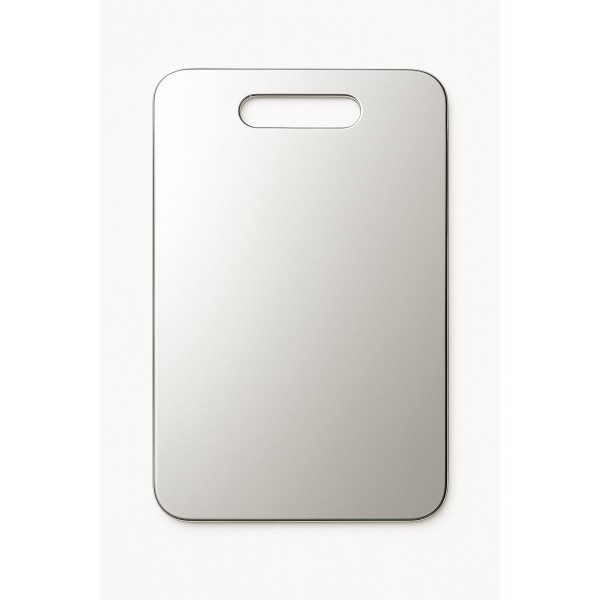 Оваа даска за сечење е изработена од висококвалитетен инокс (не’рѓосувачки челик) со огледално сјајна површина, што не само што изгледа прекрасно, туку овозможува и лесно чистење и максимална хигиена. За разлика од дрвените и пластичните даски, иноксот не впива течности, мириси или бактерии – што ја прави идеална за подготовка на месо, зеленчук, овошје или риба. Со современа, минималистичка форма и удобна рачка за држење, оваа даска не е само функционална, туку и вистински детал што внесува професионален изглед во секоја кујна.